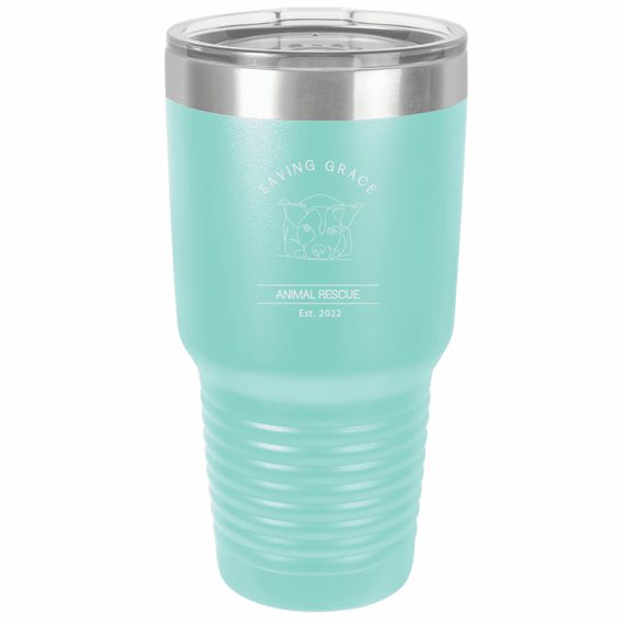 This 30oz Saving Grace Animal Rescue Tumbler with a clear top is laser engraved with the Saving Grace Animal Rescue WI logo.