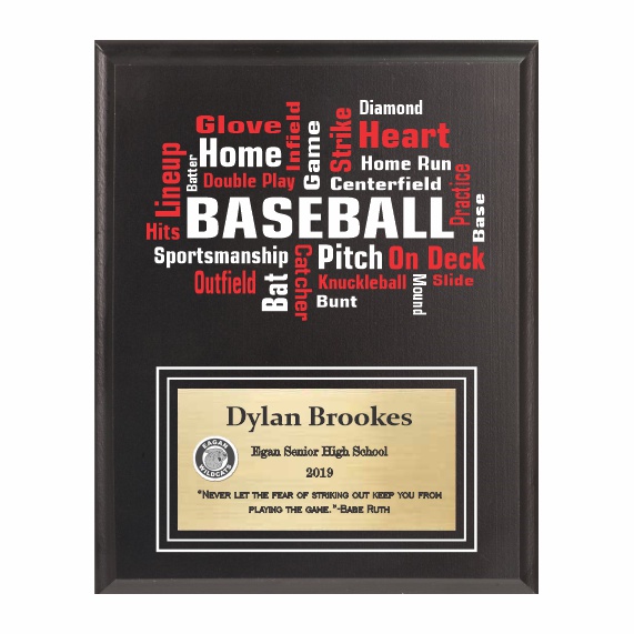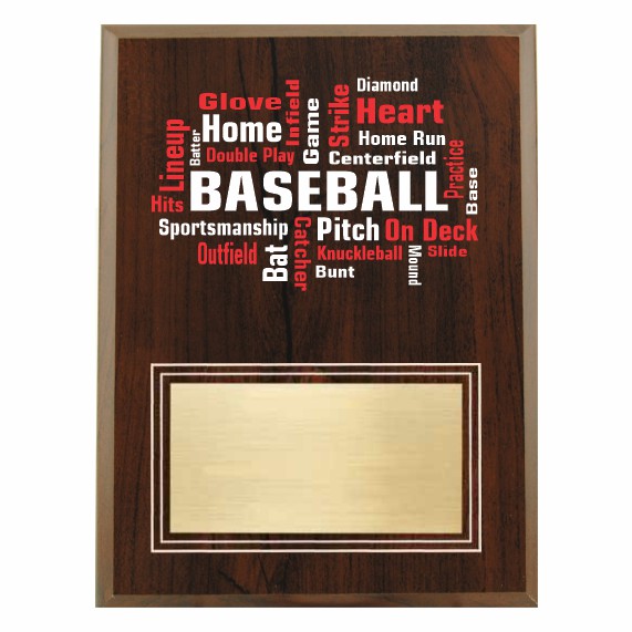 You can customize your plaque in a couple of ways. First, by adding your school colors in the baseball word cloud. Secondly, you can add your logo or emblem to the gold aluminum plate. As a result, this will be a unique plaque that your recipient will love. A $15.00 one-time setup charge will be added to your final invoice for logos that we don’t have on-file. Click here for directions on sending logo artwork. We will notify you if your artwork needs additional changes to make it usable.
