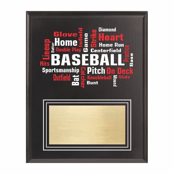 This baseball word cloud plaque comes in a cherry finish. The plaque has a personalized gold aluminum plate for your message. This amazing competitor baseball plaque has words that are unique to the sport. Therefore, making a great recognition idea for any individual or team of competitors.