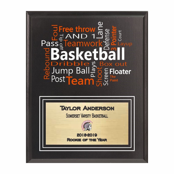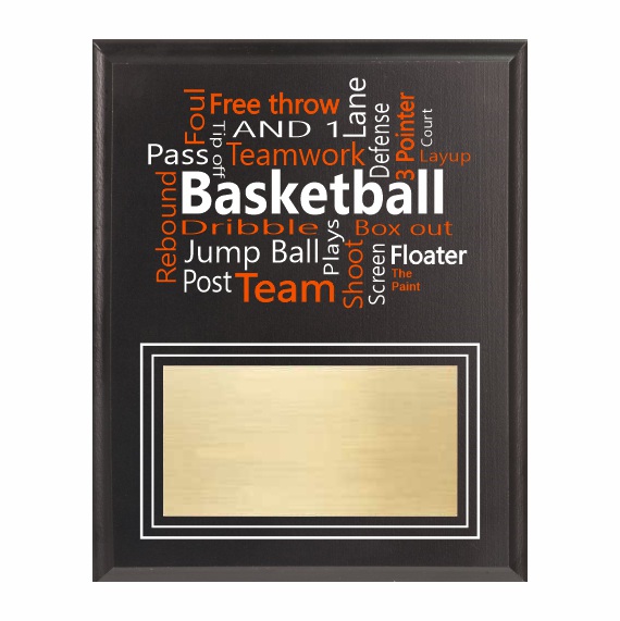 You can customize your plaque in a couple of ways. First, by adding your school colors in the basketball word cloud. Secondly, you can add your logo or emblem to the gold aluminum plate. As a result, this will be a unique plaque that your recipient will love. A $15.00 one-time setup charge will be added to your final invoice for logos that we don’t have on-file. Click here for directions on sending logo artwork. We will notify you if your artwork needs additional changes to make it usable.