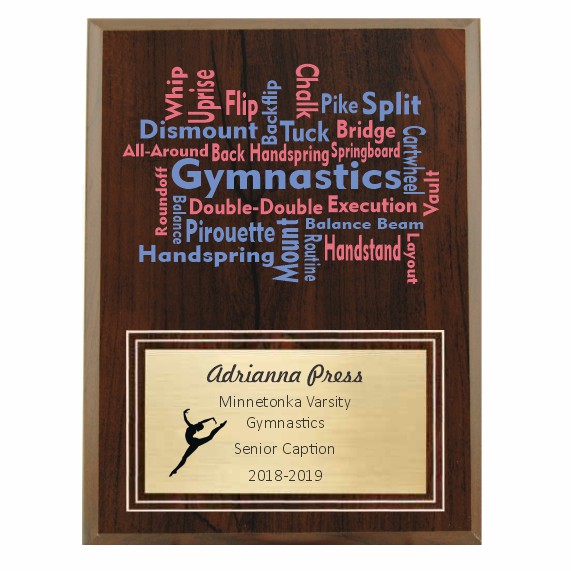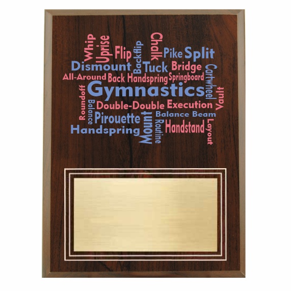 These gymnastics word cloud plaques comes in a black finish. The plaques have a blank gold aluminum plate for your message. These amazing competitor gymnastics plaques have words that are unique to the sport. Therefore, making a great recognition award for any individual or sports team.