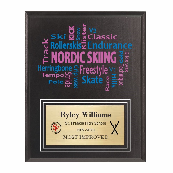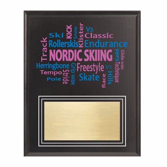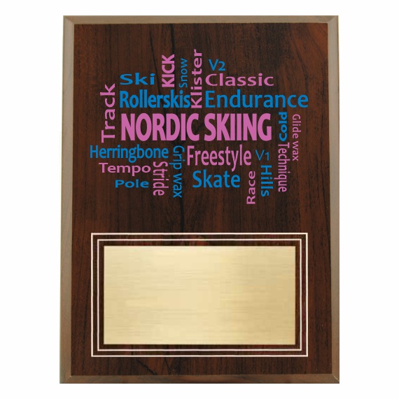 You can customize your plaque in a couple of ways. First, by adding your school colors in the nordic skiing word cloud. Secondly, you can add your logo or emblem to the gold aluminum plate. As a result, this will be a unique plaque that your recipient will love. A $15.00 one-time setup charge will be added to your final invoice for logos that we don’t have on-file. Click here for directions on sending logo artwork. We will notify you if your artwork needs additional changes to make it usable.