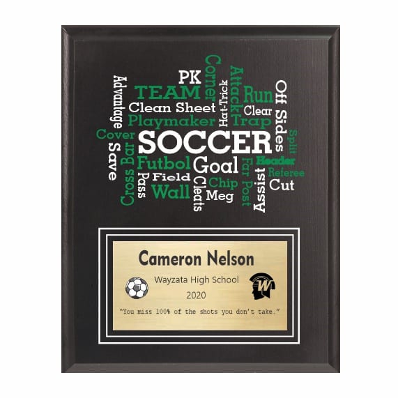 The soccer word cloud is printed in on our high quality UV printer, which produces a textured result. Thus, if you run your finger over the design you can feel the raised lines and details of the words. This plaque also has amazing color. For that reason, it will be proudly displayed and treasured by the recipient.