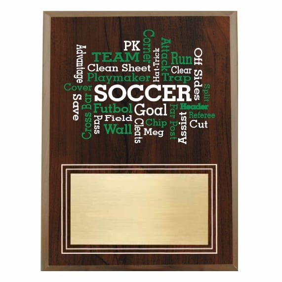 These soccer word cloud plaque awards comes in a cherry finish. The plaque has a blank gold aluminum plate for your message. This amazing competitor soccer plaque has words that are unique to the sport. Therefore, making a these great recognition awards for any individual or sports team.