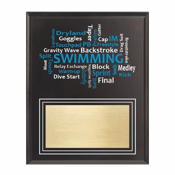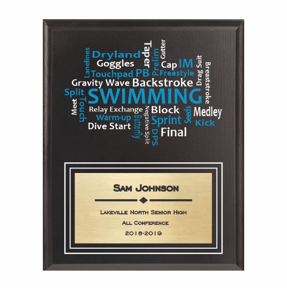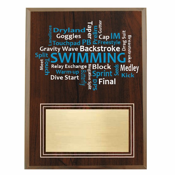 This swimming word cloud plaque comes in a cherry finish. The plaque has a personalized gold aluminum plate for your message. This amazing competitor swimming plaque has words that are unique to the sport. Therefore, making a great recognition idea for any individual or team of competitors.