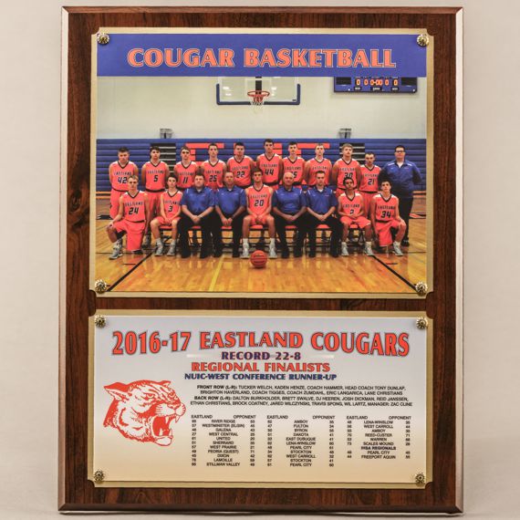 The 2 Plate – 12 x 15 Traditional Style Team Photo Plaque is a great way to recognize a team or coach for their championship or achievements. Some award ideas are for conference, regional, sectional, state championships or just for a great season. Other ideas are for sponsor plaques or just to preserve the memory of your athletes and coaches in a school, college or home. Makes a great basketball team plaque. With a custom design, you can add your personal touch to this athletic award, using your team information. Such as: Mascots, School Colors, Stats, Wins, Losses, Roster, and more.