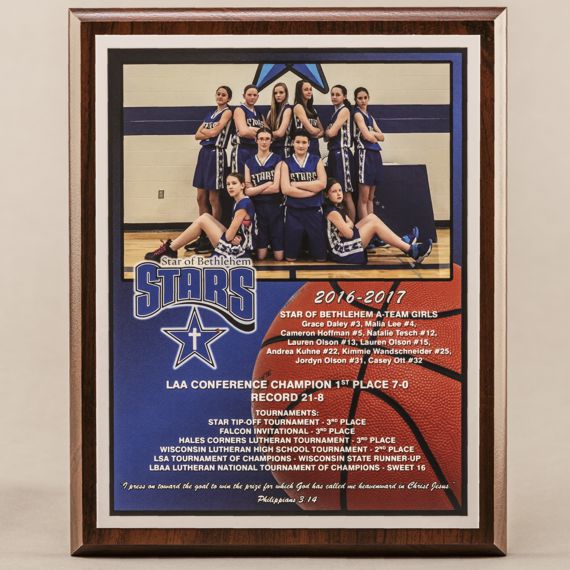 The 8 x 10 All Digital Team Photo Plaque is a great way to recognize a team or coach for their achievements. Some award ideas are for conference, regional, sectional, state championships or just for a great season. Other ideas are for sponsor plaques or just to preserve the memory of your athletes and coaches in a school, college or home. Perfect for basketball team plaques. With a custom design, you can add your personal touch to this athletic award, using your team information. Such as: Mascots, School Colors, Stats, Wins, Losses, Roster, and more.