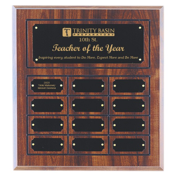The 12 Plate Cherry Finish Perpetual Plaque is an great way to dedicate any achievements, milestones or contributions. Some ideas would be for teacher of the year, remembrance, donations, employee of the month, support staff member of the year, student of the month, annual events, conference championships and many more.