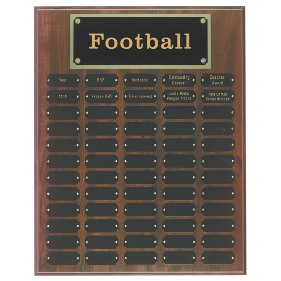 This cherry finish perpetual plaque comes with your logo or custom message engraved into the header plate, 1 perp plate engraved and 59 blank black plates. To purchase the individual plates for this plaque, see item PPP-1BK or if you special ordered gold, item PPP-1. Engraving of additional plates are $5.00 each. Plaques with gold plates are available as a special order for an additional $10, please indicate in the special instructions to choose this.
