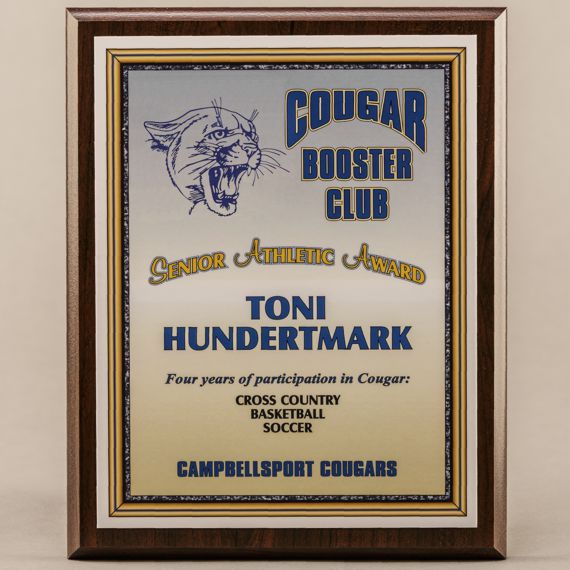 This 8”×10” Cherry Wood Grain Plaque includes a 7” x 9” graphic that is laminated and adhered directly to the plaque. The MVP Sport Plaques are the most economical.