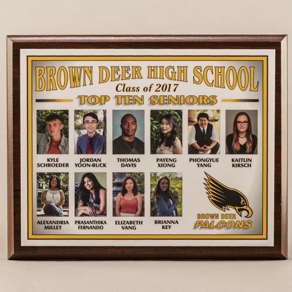 Four years of commitment to academic excellence needs to be recognized and appreciated. This Top Ten photo plaque is a unique way to recognize these hard-working students and their classmates for their outstanding achievement. Hung in the school trophy case or office this plaque also becomes a way for the school to recognize not just its athletic success but it’s academic superstars.