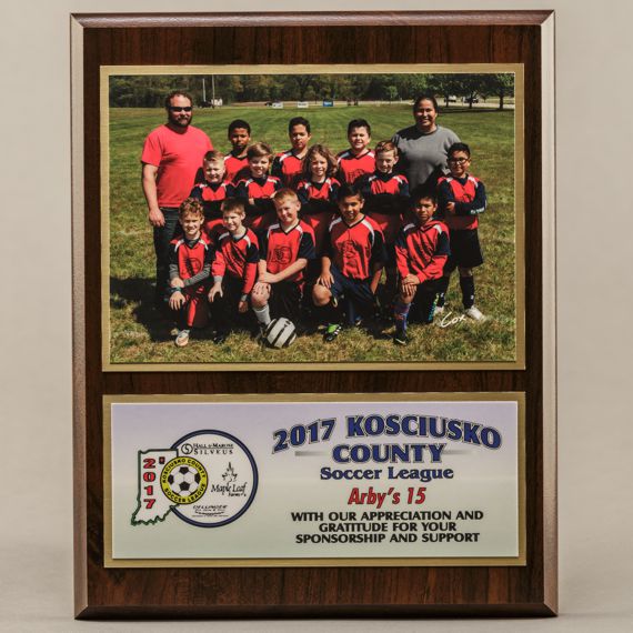 The 8 x 10 Classic Style Team Photo Plaque is a great way to recognize a soccer team or coach for their achievements. Some award ideas are for conference, regional, sectional, state championships or just for a great season. Other ideas are for sponsor plaques or just to preserve the memory of your athletes and coaches in a school, college or home. Makes a great soccer team photo plaque. With a custom design, you can add your personal touch to this athletic award, using your team information. Such as: Mascots, School Colors, Stats, Wins, Losses, Roster, and more.