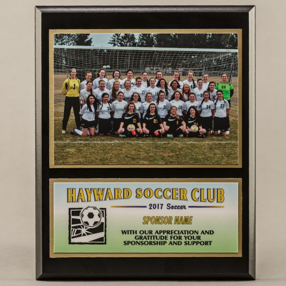 The 8 x 10 Coach or Sponsor Photo Plaque is a great way to recognize a coach or sponsors for their contributions. An award idea is to give these to that Sponsor that donated equipment, money or time. Another idea would be to give to a coach that has dedicated their time, leadership and support to a team. With a custom design, you can add your personal touch to this athletic award, using your information. Such as: Mascots, School Colors and more.