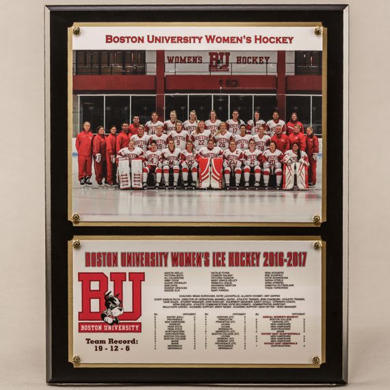 The 2 Plate – 12 x 15 Traditional Style Team Photo Plaque is a great way to recognize a team or coach for their achievements. Some award ideas are for conference, regional, sectional, state championships or just for a great season. Other ideas are for sponsor plaques or just to preserve the memory of your athletes and coaches in a school, college or home. Makes a good hockey team photo plaque. With a custom design, you can add your personal touch to this athletic award, using your team information. Such as: Mascots, School Colors, Stats, Wins, Losses, Roster, and more.