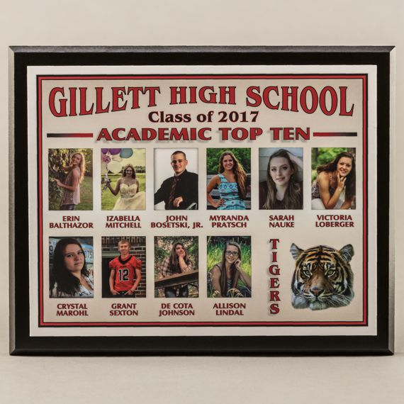 Four years of commitment to academic excellence needs to be recognized and appreciated. This Top Ten photo plaque is a unique way to recognize these hard-working students and their classmates for their outstanding achievement. Hung in the school trophy case or office this plaque also becomes a way for the school to recognize not just its athletic success but it’s academic superstars.