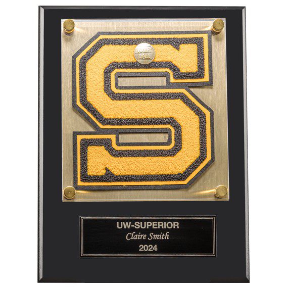 Your varsity letter with your chosen sport pins are adhered to a metal plate on a 9×12″ black plaque then securely covered with an acrylic plate, mounted with matching standoffs.